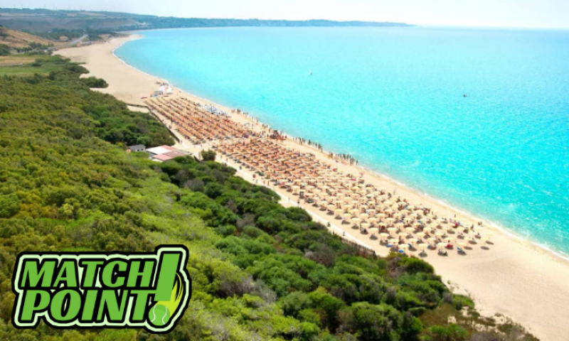 La spiaggia del Serenè Resort è una lunga distesa di sabbia chiara che si estende per chilometri nell'azzurro del Mar Ionio.