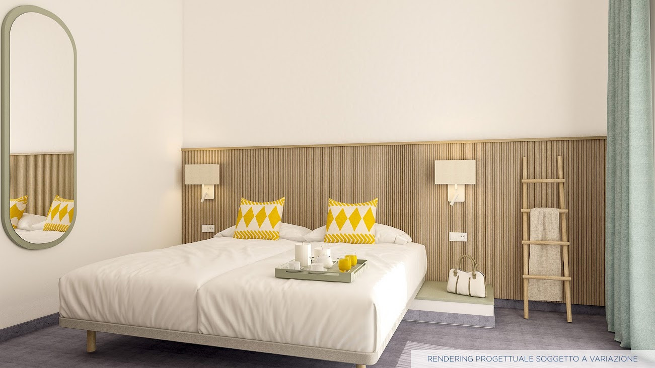 Ideale per 4 ospiti, con il letto matrimoniale separato dai due letti singoli da eleganti elementi d'arredo. La zona notte è stata rinnovata nel 2023 e il bagno nel 2024.