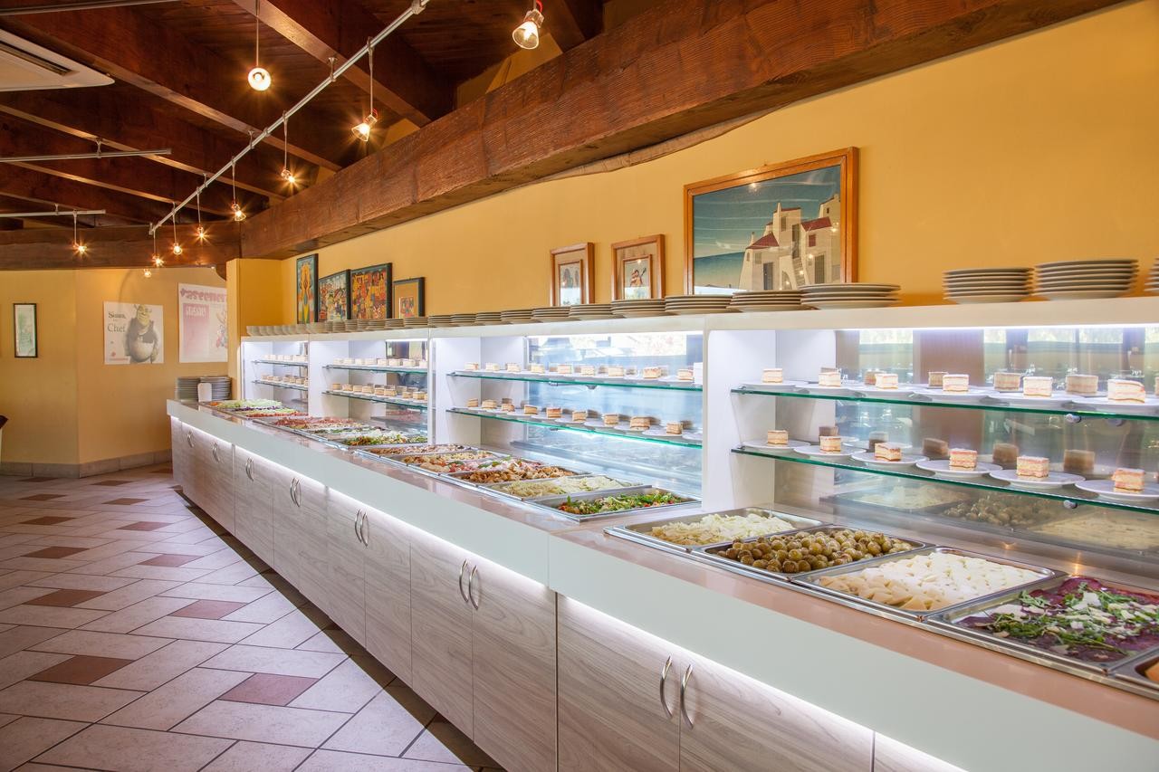 Pranzo e cena prevedono un buffet formato da 3 primi, 3 secondi e un'ampia scelta di antipasti e verdure.