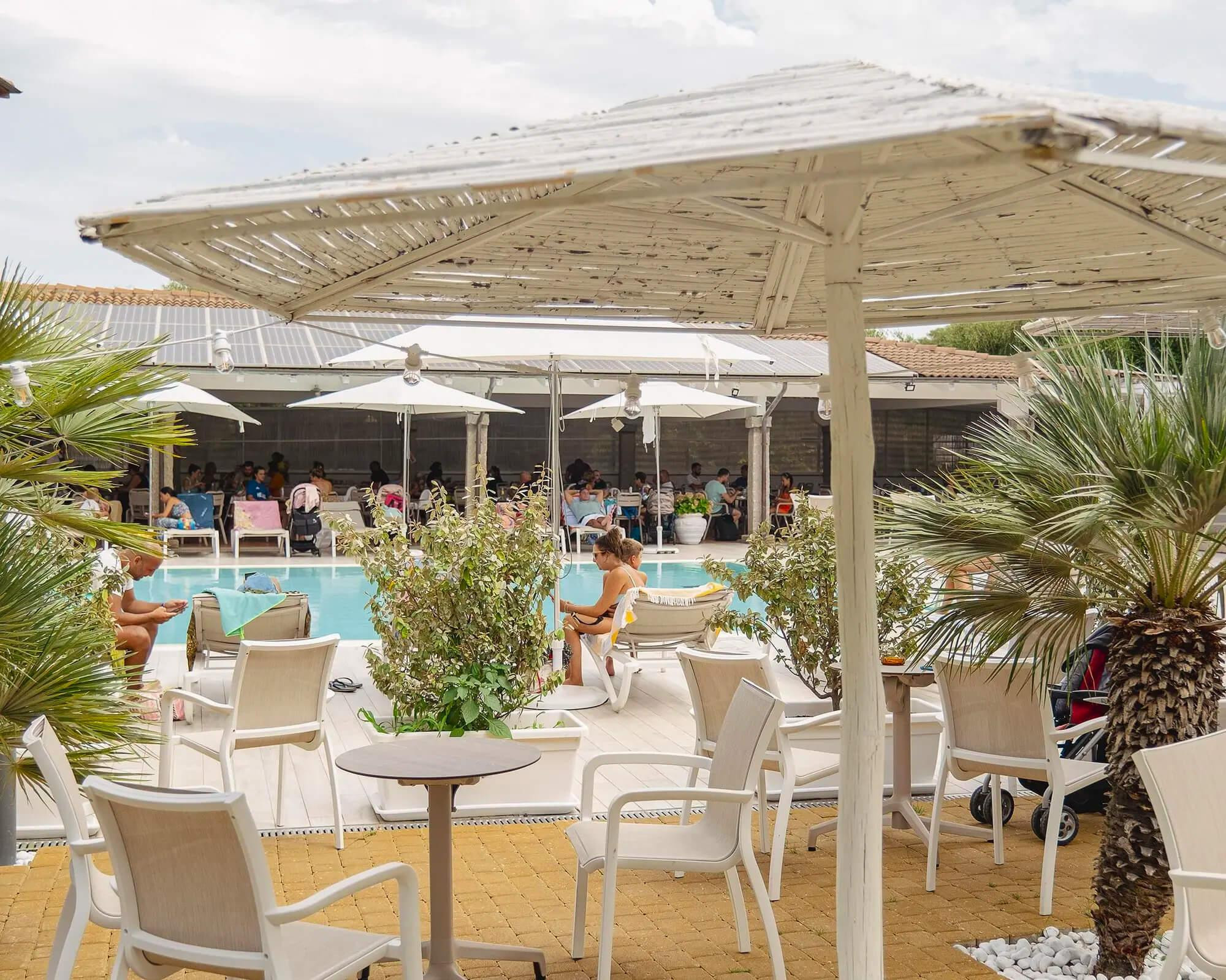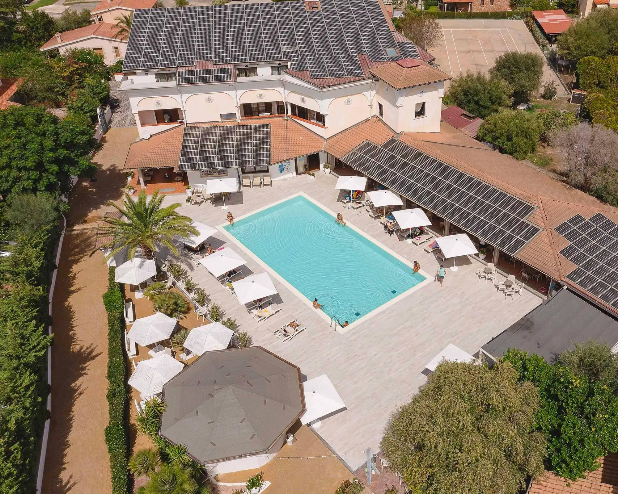 Al centro dell'hotel ci sono due piscine, una per adulti e una per bambini, circondate da solarium attrezzato.