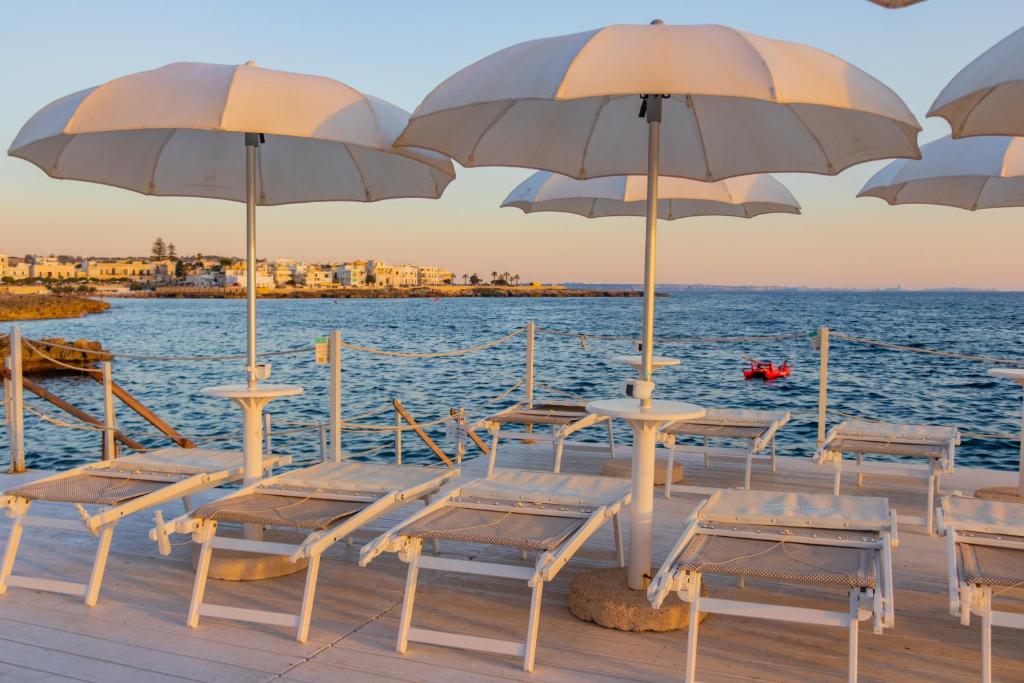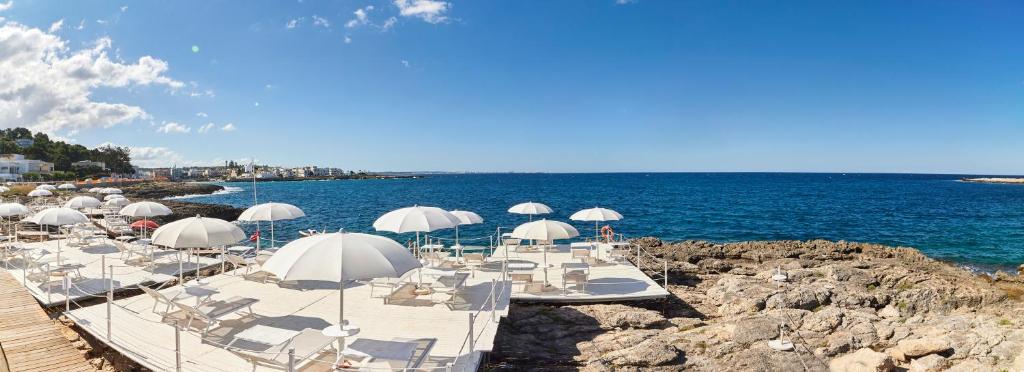 Il Grand Hotel si affaccia direttamente sul mare, su di una spiaggia di rocce privata attrezzata con pedane di legno, ombrelloni e lettini.