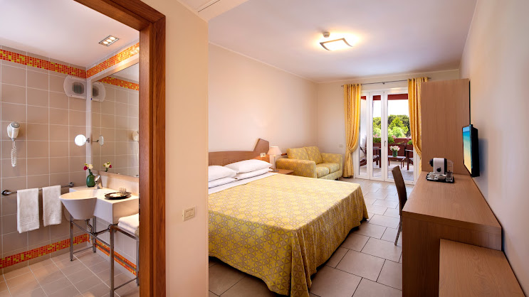massimo comfort. Oltre alle dotazioni delle camere Classic, ti offrono bagno con vasca, bollitore con tè e tisane, TV con canali Sky anche per bambini e omaggio di 2 teli mare personalizzati Serenella per i più piccoli. Puoi scegliere anche le Family Pool View, al primo piano, con balconcino affacciato sulla piscina.