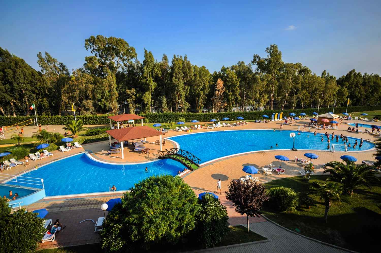 Include uso piscine con ombrelloni e lettini, animazione diurna con corsi sportivi collettivi di tennis, calcetto, beach volley, basket, tiro con l’arco, aerobica, step, yoga, training autogeno, lezioni di ballo, junior club, corsi dj per junior club, uso diurno dei campi sportivi, animazione serale con spettacoli in anfiteatro, ombrellone in spiaggia.