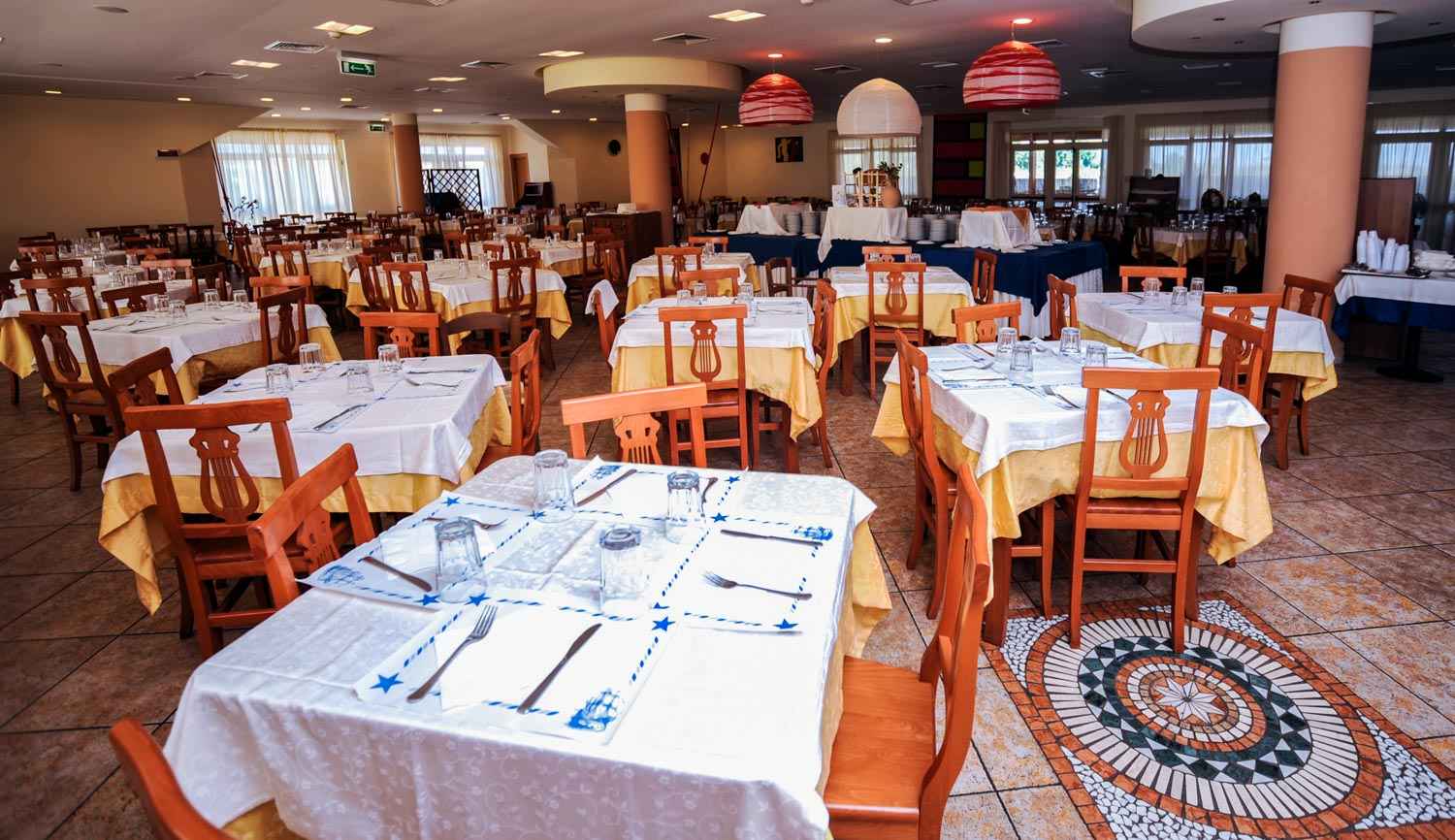 Il ristorante climatizzato offre tavoli assegnati e buffet servito con piatti della tradizione locale e mediterranea, pasta fresca fatta in casa e una scelta tra due primi e due secondi, di cui uno alla griglia. Disponibile una pizzeria napoletana a buffet (solo cena), frutta e gelato a pranzo, dolci e frutta a cena. Momenti speciali includono piatti a sorpresa il lunedì e mercoledì sera.